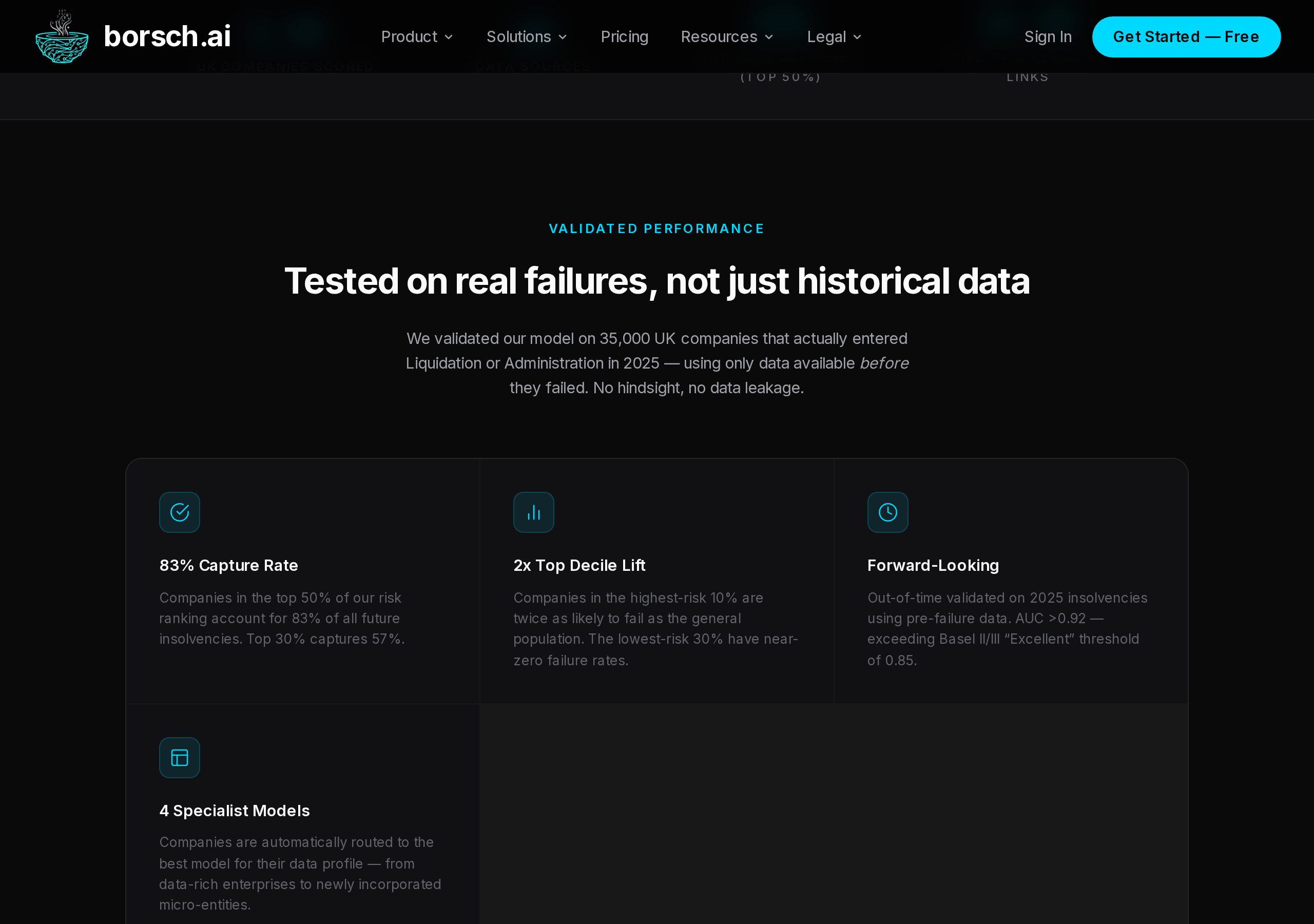 Model performance is validated on out-of-time insolvency data: companies that failed after the training period, ensuring the model generalises to future events rather than overfitting to historical patterns.